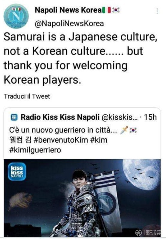 在金玟哉海报上误用日本武士旗,那不勒斯电台向韩国网友道歉