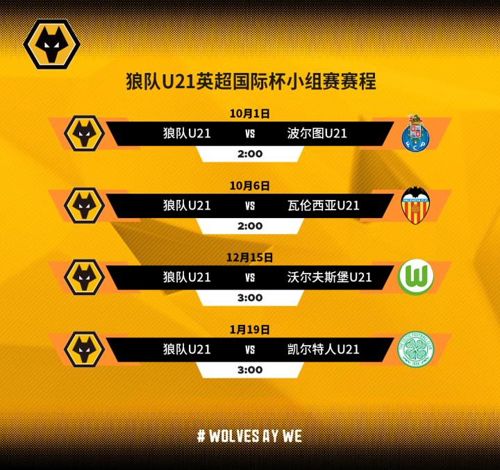 英格兰狼队足球俱乐部新赛季狼队U21将再次参加英超国际杯,经过抽签,小狼们和波尔图U21、瓦伦西亚U21、沃尔夫斯堡U21、凯尔特人U21同分在A组。