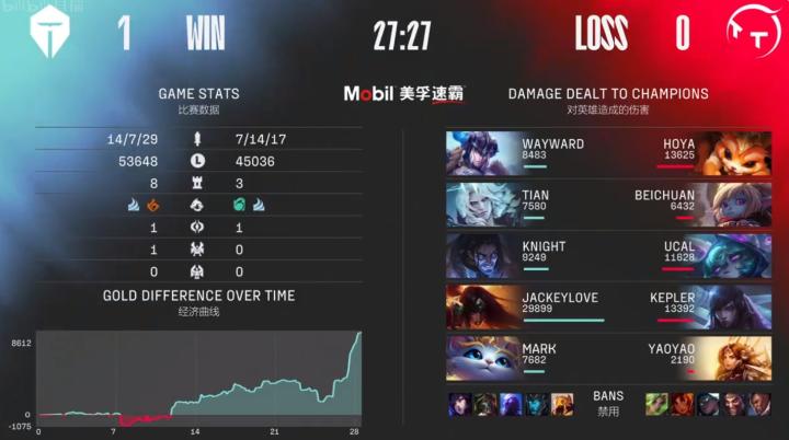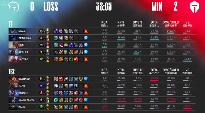 第27分钟,TES推进击杀TT四人一波结束比赛,恭喜TES先下一城。