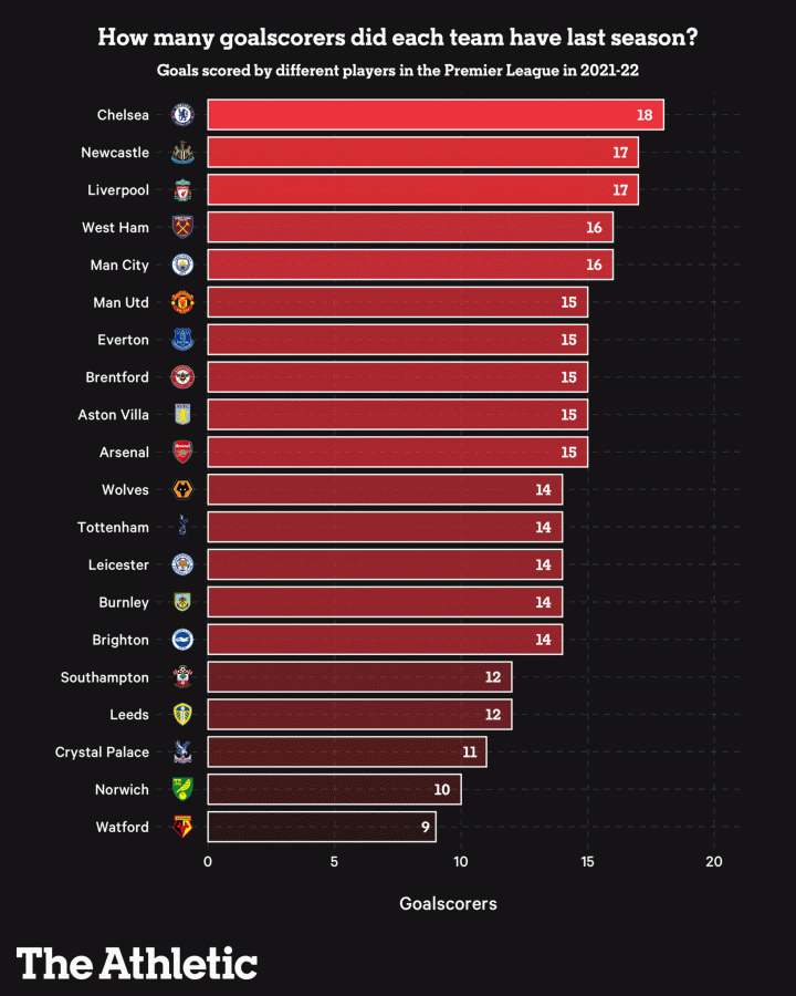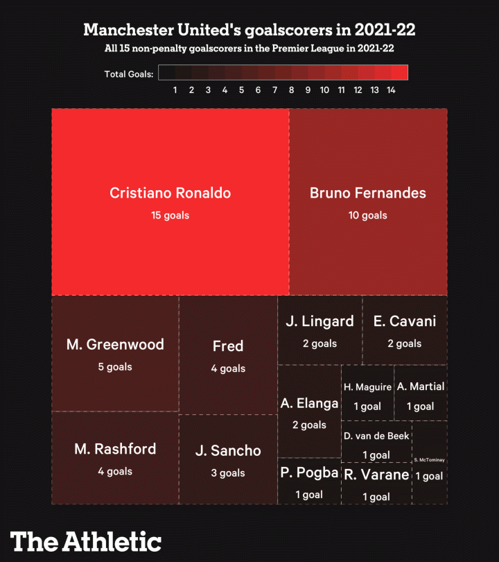 初看起来,C罗回归前后的两个赛季里,曼联的联赛进球队员数量基本没变。