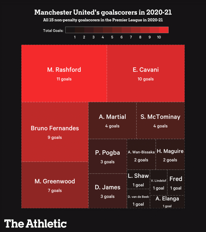 2020-21赛季曼联其他队员的进球贡献也确实更多一些。
