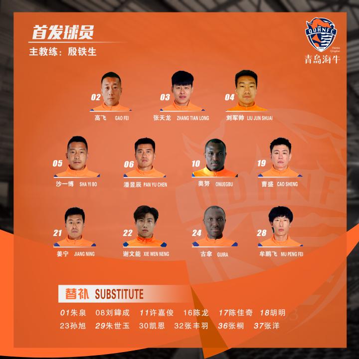 此役教练组沿用了上轮战胜黑龙江冰城的首发阵容,门将是牟鹏飞,后防线从左至右分别是沙一博、张天龙、刘军帅、高飞,姜宁、古拿继续搭档后腰,潘昱辰坐镇前腰进行组织调度,曹盛、谢文能两翼齐飞,近来状态火热的奥努埃布继续出现在中锋位置。