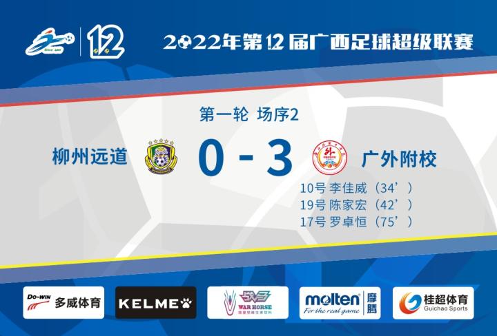 比赛进行到第32分钟,广外附校10号李佳威就为球队首开纪录,广外附校在客场先声夺人;第42分钟,联盟杯有出色发挥的19号陈家宏扩大比分,2-0;下半场进行到第75分钟,17号罗卓恒再下一城,比分锁定在3-0。广外附校收获赛季首胜,积分榜上升到小组头名。
