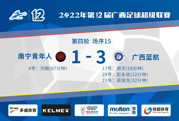 上半场卫冕冠军广西蓝航反客为主,第18分钟一次精彩的斜传直插配合,17号胡天首开纪录,1-0;第22分钟,29号彭永信断球之后一记凌空落月斩世界波扩大到2-0;这名02年的小将用一记弯弓射大雕致敬桂超第500场的盛宴;第32分钟,21号吴佳龙反越位扩大到3-0;下半场南宁青年人全力反击,第87分钟,24号刘广新边线球助攻,8号刘毅高速插上小角度劲射破门,扳回一分,最终南宁青年人1-3不敌广西蓝航,双方用4个精彩的进球纪念桂超联赛的第500场比赛,广西蓝航三连胜排名小组第一。