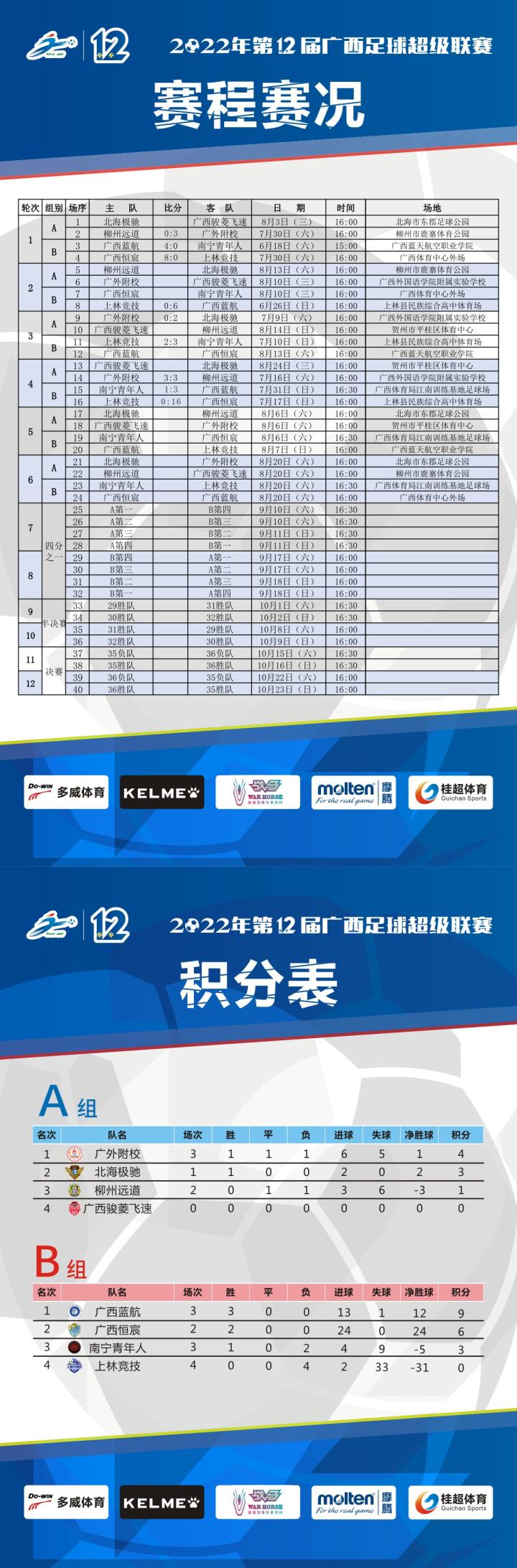 耀武酒肆工作室7月30日—31日,2022第12届桂超联赛在南宁柳州两地激战三场,桂超历史上第500场比赛,广西蓝航击败南宁青年人;广西恒宸主场大胜上林竞技;广外附校拿到赛季首胜。参加本赛季中冠联赛的四支桂超球队取得理想佳绩。
