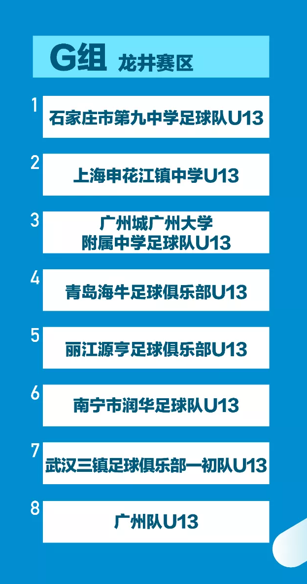 代表广西出战的南宁润华U13队分在G组,同组另外七支球队是:石家庄市第九中学足球队U13、上海申花江镇中学U13、 广州城广州大学附属中学足球队U13、青岛海牛足球俱乐部U13、丽江源亨足球俱乐部U13、南宁市润华足球队U13、武汉三镇足球俱乐部-初队U13、广州队U13。G组的比赛全部在吉林延边龙井海兰江足球小镇举行。