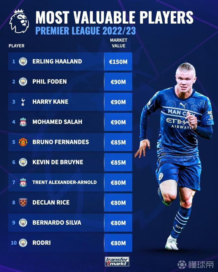 在哈兰德之后,福登、凯恩和萨拉赫均以9000万欧元的身价排在并列第二的位置,布鲁诺-费尔南德斯和德布劳内的身价则均为8500万欧元。
