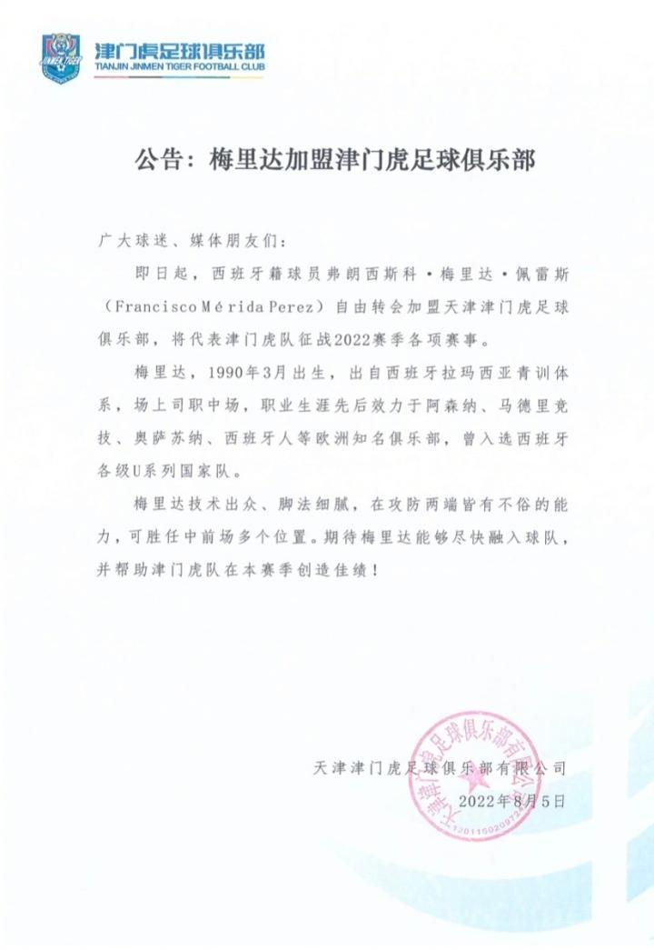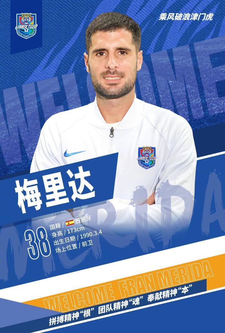 北京时间8月5日,天津津门虎官方宣布,此前效力于西甲西班牙人的32岁中场球员梅里达加盟球队,他将身披津门虎38号球衣。