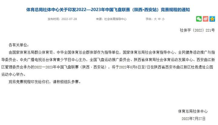 7月28日,体育总局社体中心印发《2022—2023年中国飞盘联赛(陕西·西安站)竞赛规程的通知》。首届飞盘联赛将于2022年8月6日至7日在陕西省西安市曲江新区杜邑遗址公园运动中心举办。