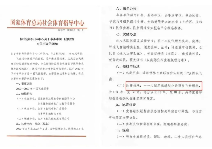 而在国家体育总局社体中心发布的一则通知中,拟定于2022年下半年举办首届中国飞盘联赛,其中比赛场地设置是将11人制的足球场划分为两块场100米、宽30米的飞盘场地。