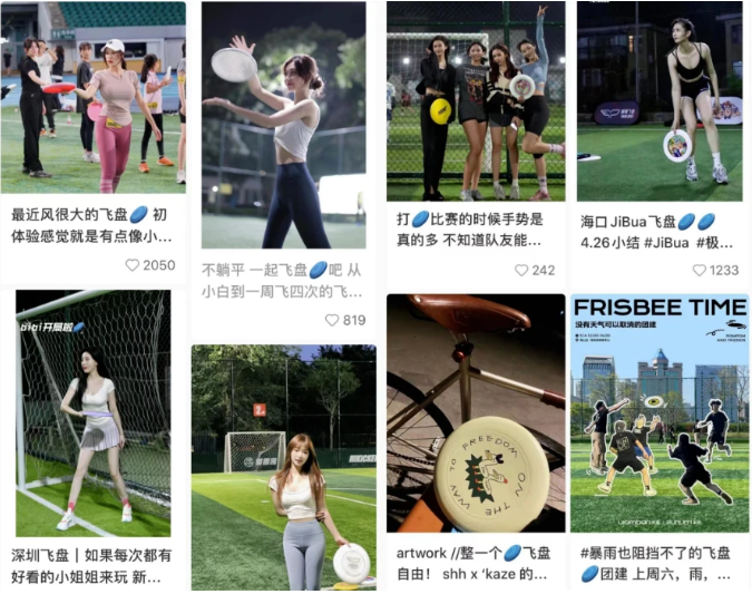 在抖音公布的《2022十大潮流生活趋势报告》中,42.4%的用户将户外休闲运动作为重要的娱乐放松方式,每年都会参加户外活动的人中,63.9%选择公园。小红书的《2022年十大生活趋势》显示,去年一年,飞盘相关内容的发布量同比增长了6倍。今年清明假期,飞盘相关的搜索量比去年同期增长约24倍,五一假期飞盘相关搜索量同比增长约40倍。打开小红书搜索“飞盘”,可以显示出7万多篇笔记。