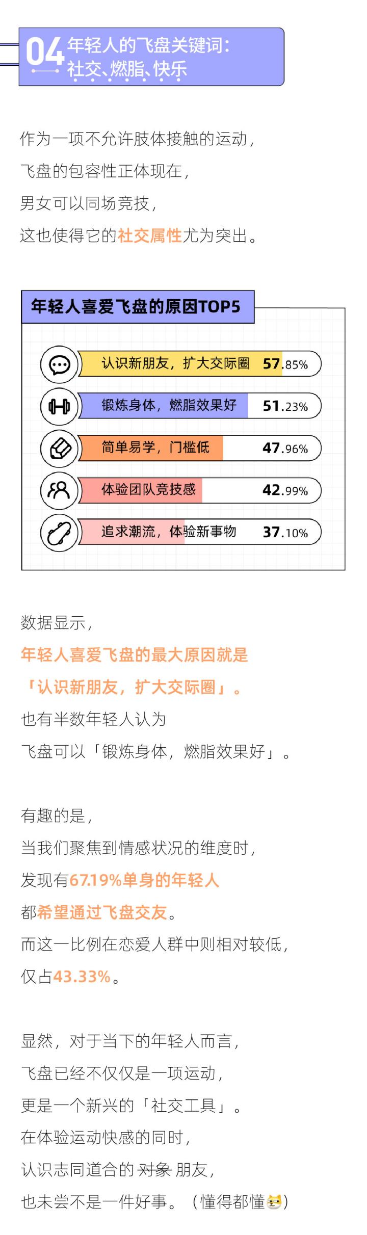 另一方面,飞盘融合了橄榄球、足球和篮球等运动的团队性,兼具了娱乐性和社交性。而社交属性强,也是年轻人偏爱飞盘运动的原因之一。数据显示,2021年全国玩飞盘的人数超过了50万人,而在2022年,飞盘一跃成为年轻人喜爱的潮流运动第一,占比超过40%;超过60%的单身年轻人希望通过飞盘交友。