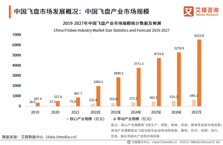 2021年,中国飞盘产业核心市场规模为75.9亿元,带动产业市场规模为867.7亿元。预计未来六年中国飞盘核心产业规模和带动产业规模持续增长且增长速度加快。