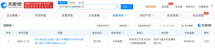 据天眼查显示,此次《体育总局社体中心关于举办中国飞盘联赛有关事宜的通知》中的赛事运营单位“杭州飞盘文化发展有限公司”,成立于2019年1月,前两年曾中标浙江省社区运动会飞盘公开赛暨2020年杭州首届飞盘公开赛,中标金额为97838.0元。