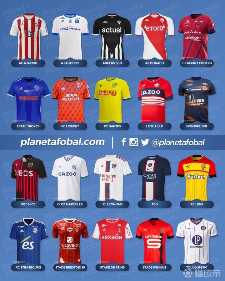 法甲2022-23赛季各支俱乐部主场球衣一览。