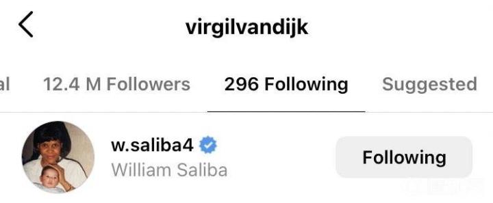 利物浦世界级中后卫范戴克在比赛结束后主动在社交媒体上关注了萨利巴,这是来自同行的认可。