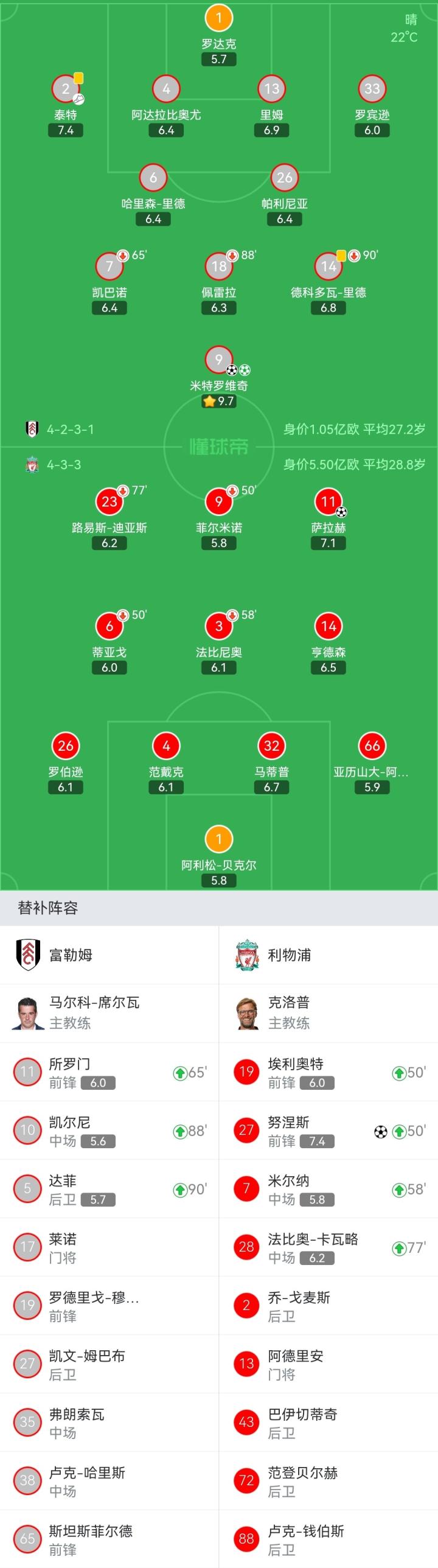 富勒姆首发:1-罗达克、2-泰特、4-阿达拉比奥尤、13-里姆、33-罗宾逊、26-帕利尼亚、6-哈里森-里德、18-佩雷拉(89'10-凯尔尼)、7-凯巴诺(64'11-所罗门)、9-米特罗维奇、14-德科多瓦-里德(90+4'5-达菲)