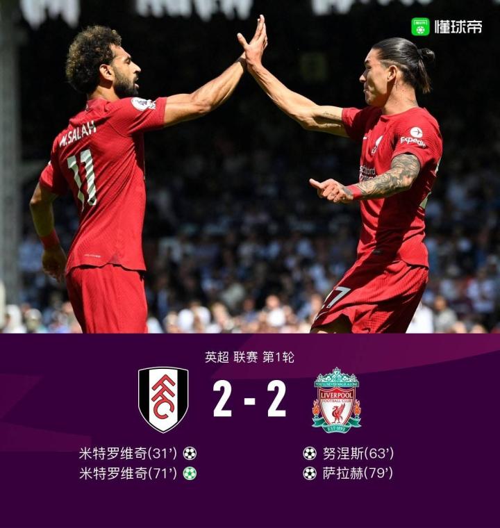 利物浦两度落后2-2富勒姆,努涅斯传射萨拉赫破门,米神双响