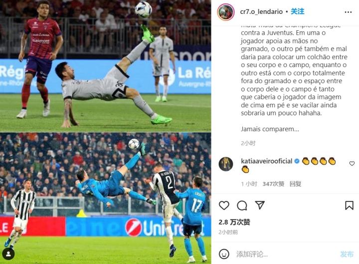 Factos哥发出了两人分别打进倒钩时的图片,并写道:一个是倒钩,另一个是凌空射门。一个是法甲对阵克莱蒙的比赛,另一个是欧冠淘汰赛对阵尤文图斯的比赛。一个是球员把手撑在草坪上,一只脚也撑在草坪上,身子和场地之间连一个床垫都放不下;另一个则是完全从草坪腾空而起,身体和场地之间还有空间。上面那张图的球员(梅西)体态还有点不太稳定,哈哈哈……绝不要比较……