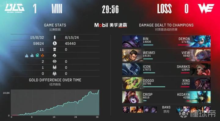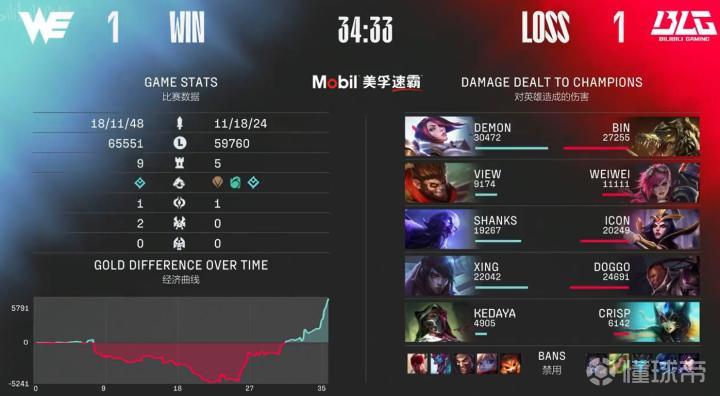 第一局,24分钟WE先行击杀冰女,随后BLG.Bin贾克斯进场一打五配合队友击杀WE四人拿到风龙听牌。BLG推上高地击杀WE双C一波终结比赛,恭喜BLG先下一城