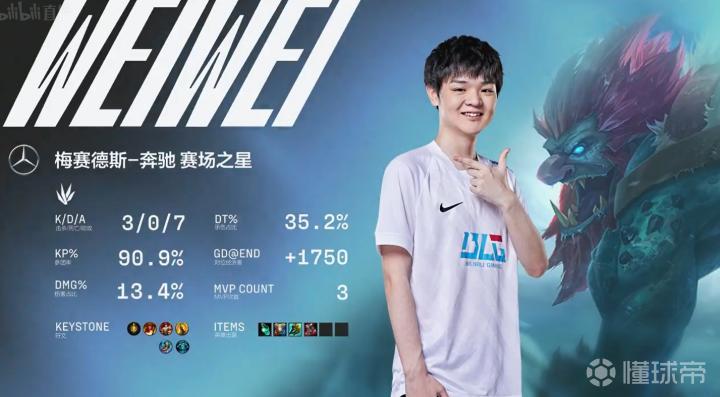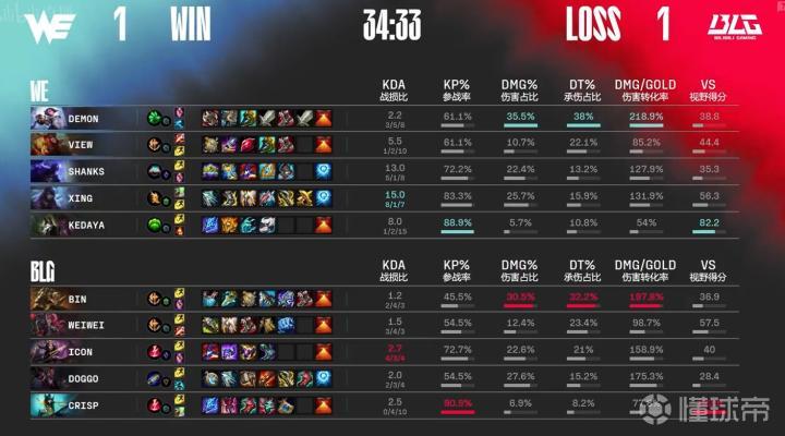 第三局,BLG卢锡安开大击杀WE野辅两人顺势拿到第二条峡谷先锋。BLG领先1W2经济推上高地击杀WE两人一波结束比赛,恭喜BLG拿到第七胜。