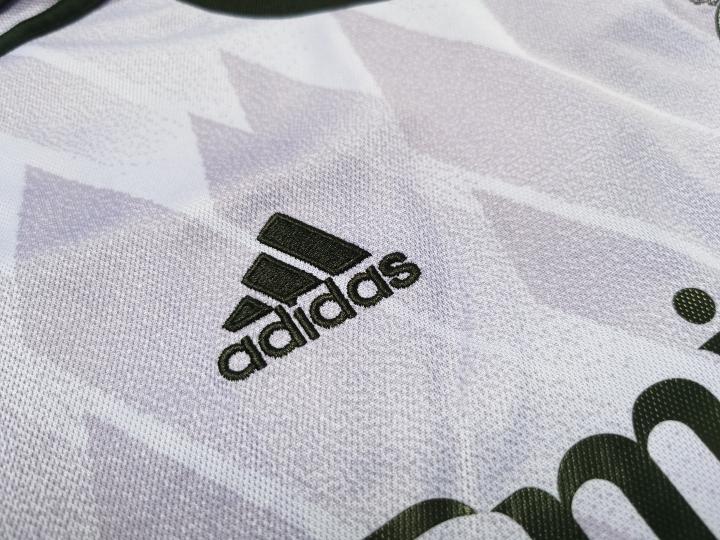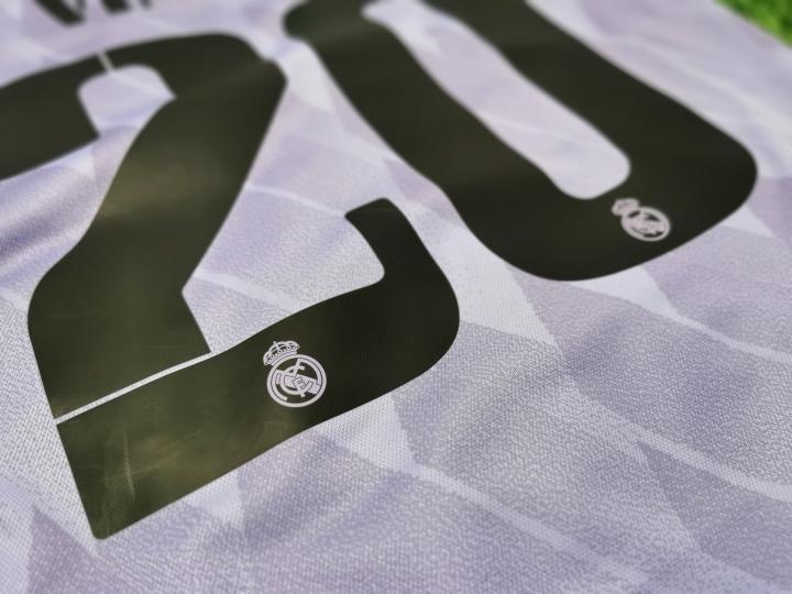 左右和球衣配套的杯赛印字,皇马的字号字形号体都致敬了20年前皇马的100周年时期的复古字体,今年也恰逢是120周年庆典,可以说是向经典的细节致敬,号码中的队徽颜色也用呼应了球衣颜色的紫色呈现。