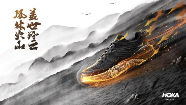 2021年3月,HOKA ONE ONE推出Speedgoat 4「羚云」配色跑鞋,灵感来自于中国传统文化经典《孙子兵法》中的“风林火山”,即“其疾如风、其徐如林、侵掠如火、不动如山”,对应在越野跑上,则代表着速度、节奏、能量、毅力。鞋款名称“羚云”则与“凌云”谐音,在外观设计上,象征古代帝王尊贵地位的黑金为主色调,鞋侧以中华特色的“祥云”图案点缀。