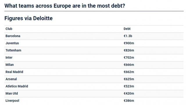 截止北京时间6月1日,根据国际会计事务所德勤统计,巴萨负债高达13.5亿欧元,折合人民币97亿,全欧第一,冠绝群雄。我们要知道,这里面的负债并非简单针对球员,而是整个巴萨。像员工开支,俱乐部开支,各种维护等等都包括在内。这是一个整体,而非某个特定对象。