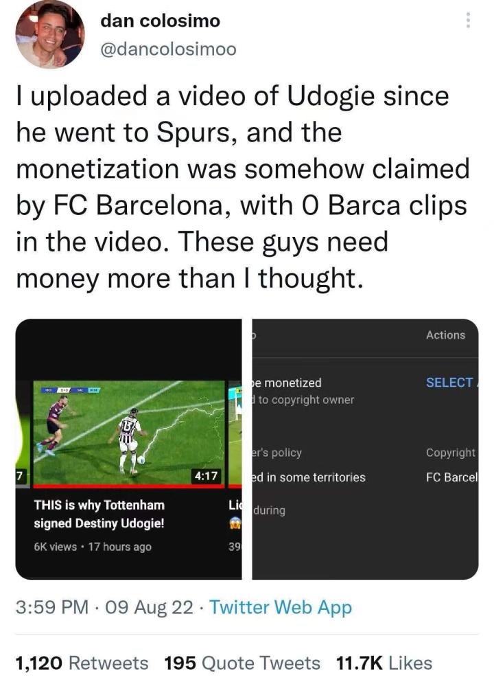 缺钱的巴萨真的想尽脑汁。之前一油管博主创作奖励被巴萨拿走。原因是因为一油管博主做了一个乌多基本的视频。巴萨声称他们对视频拥有版权,而事实上乌多基的视频中根本就没有巴萨的因素。巴萨为了创收钻了空子……