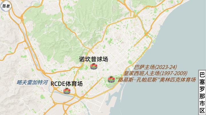 巴萨的同城对手是武磊曾效力过的皇家西班牙人,虽然他们的主场只相距5000多米,但西班牙人的RCDE体育场在行政区划上已经不在巴塞罗那市内,而是位于略夫雷加特河畔埃尔普拉特市(El Prat de Llobregat),一个名称很长的建制市。