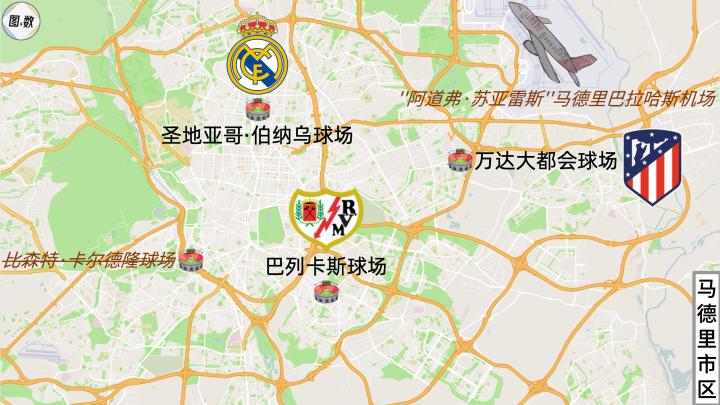 马德里市郊还有一支准首都球队——赫塔费,他们位于马德里自治区的赫塔费市,不属于马德里市,但实际只有一街之隔,因为他们处在作为市界的M45高速公路以南,路北就是马德里市的比利亚韦德区(Villaverde)。