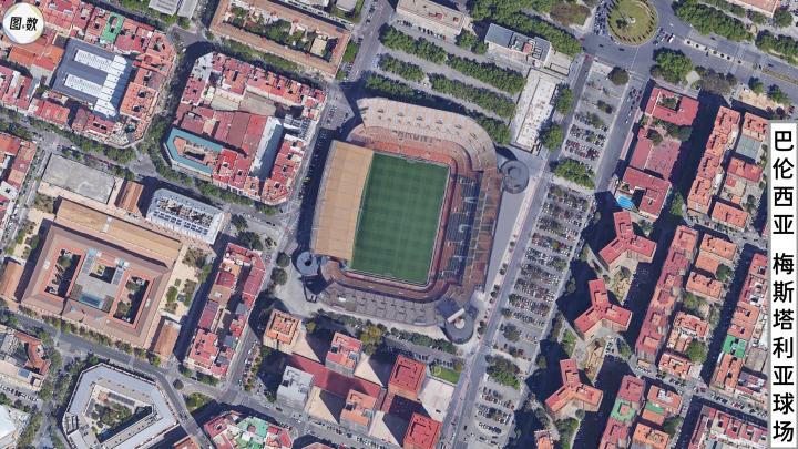 巴伦西亚的主场是梅斯塔利亚球场,得名于当地历史上颇为重要的梅斯塔利亚灌溉渠(Acequia de Mestalla),其建成于1923年,距今将近100年,目前的容量是4万多人。同时,巴伦西亚正在城西营造未来的主场——新梅斯塔利亚球场。