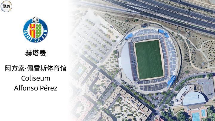 赫塔费的主场是容量不到两万人的阿方索·佩雷斯大体育场,其纪念的是出生在当地的西班牙国脚阿方索·佩雷斯,尽管他从未在赫塔费效力。此外,这是西甲唯一以“大体育场”(Coliseum)为名的球场,词源则是罗马斗兽场(Colosseo)。