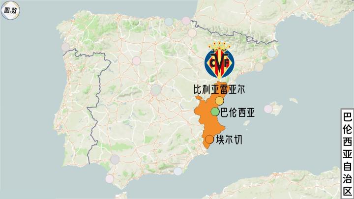 马德里自治区东侧是卡斯蒂利亚-拉曼恰自治区,再向东则是沿海的巴伦西亚自治区,其下辖3个省,每个省都是有且仅有一支西甲球队,其中最北面的是“黄色潜水艇”——比利亚雷亚尔,它位于卡斯特利翁省比利亚雷亚尔市,这是目前拥有西甲球队的最小城市,仅有5万余人。