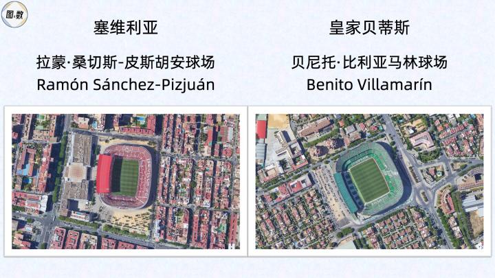 作为同城德比对手,塞维利亚和皇家贝蒂斯的主场除颜色不同外,不仅在外形方面颇为相似,而且还都使用俱乐部历史上的功勋主席来进行命名。在容量方面,可承载6万余人的贝尼托·比利亚马林球场更大一些,仅次于巴萨、皇马和马竞的主场,而拉蒙·桑切斯-皮斯胡安球场要小一些,官方容量不到5万人,但它曾举办过欧冠决赛,罗马尼亚的布加勒斯特星通过点球大战,以2-0击败巴萨而夺冠。