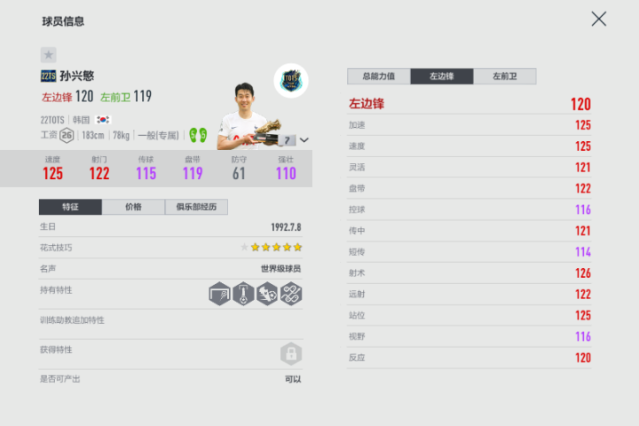 众所周知,孙兴慜一直以来都是游戏中的“香饽饽”,他在排位赛和职业比赛中的发挥都非常稳定,进球效率达到场均1球。这张22TS孙兴慜也是他的巅峰赛季卡,相比CAP赛季,他在传中和身体对抗方面进步明显,有着丝滑的手感和拿球体验,只要不被多名球员包围,一般不会丢球。另外,他的跑动能力一直都是他的优势,尤其是在上个版本,直塞为王的时候孙兴慜的获单刀次数还要高,而结合他双五脚的均衡射术,无论是搓射还是低射,孙兴慜都有着很棒的单刀进球效率。因此,从实战的角度来说,22TS孙兴慜在各方面都是游戏顶尖的,即插即用,能适应各种阵型,不过他唯一的缺点就是工资较高,26点工资也意味着需要在边后卫上使用低工资高强化的球员。