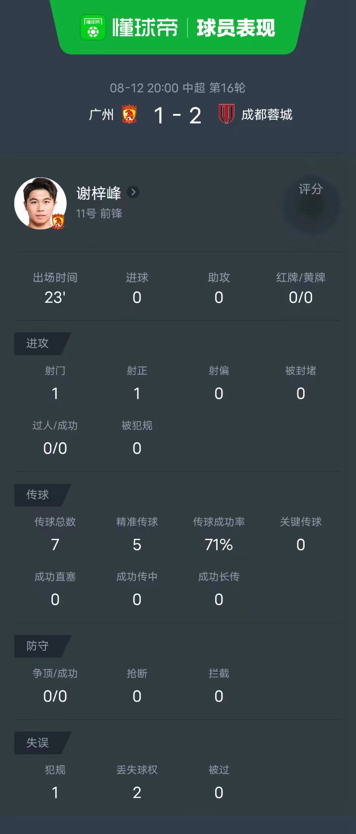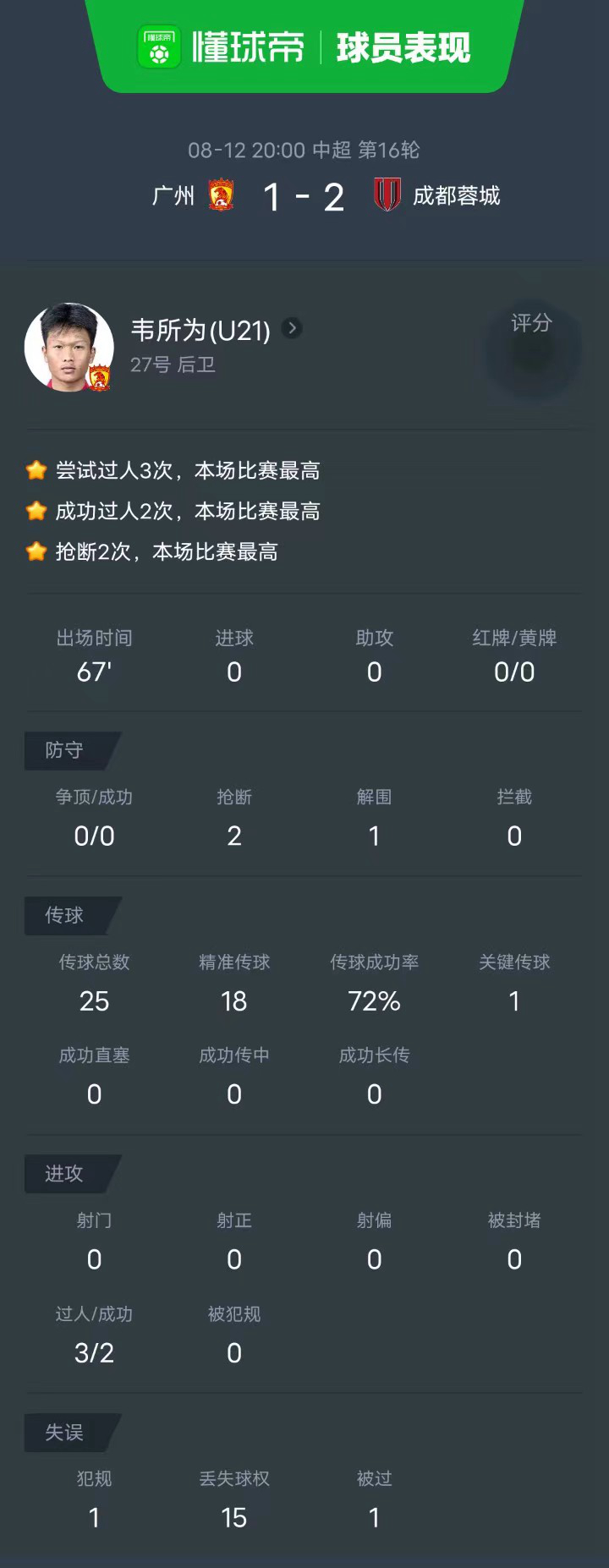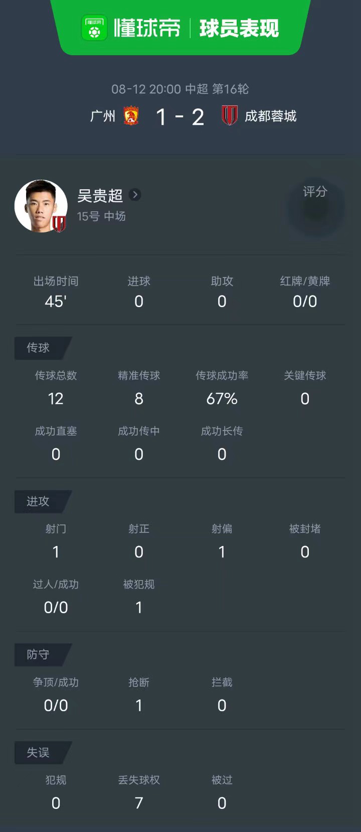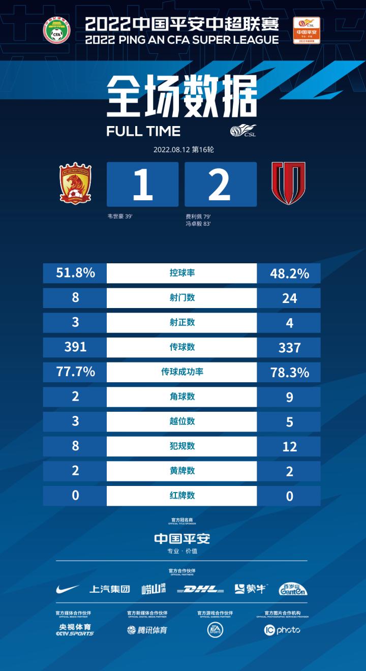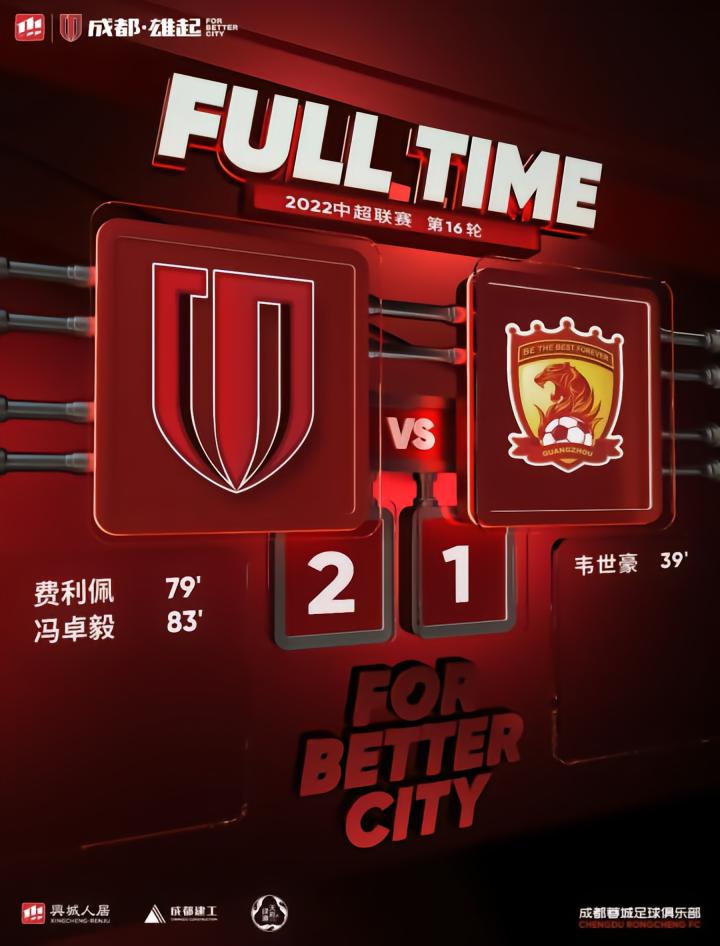 8月12日20:00,中超第16轮提前进行,广州对阵成都蓉城。上半场比赛,胡睿宝错失绝佳机会又击中横梁,韦世豪任意球折射破门;下半场,理查德进球被吹无效,费利佩替补破门后又助攻冯卓毅完成逆转。最终广州1-2不敌成都。