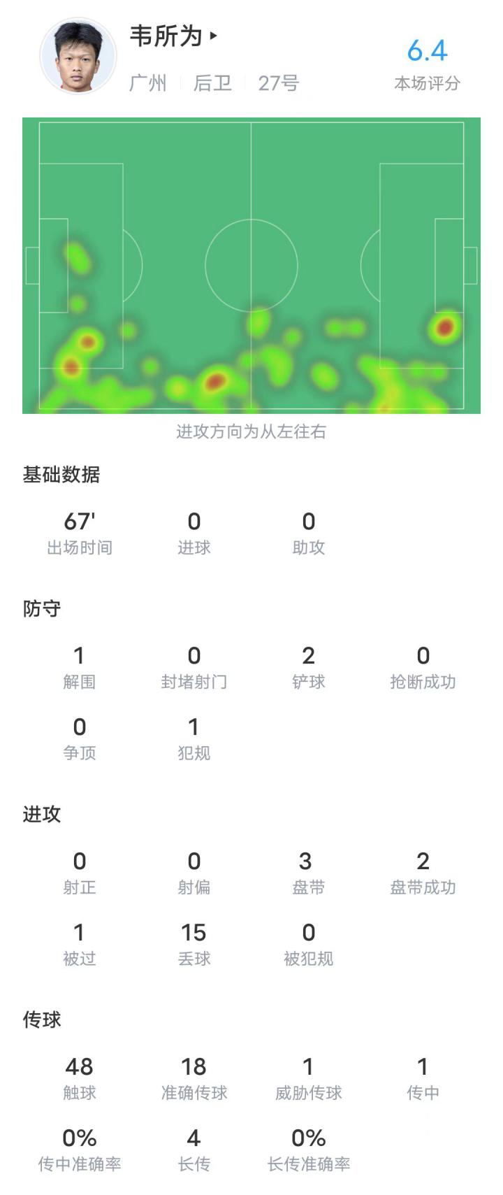 (韦所为连续第二场代表广州队首发登场)