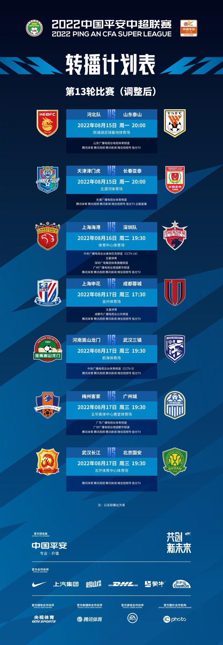 根据转播计划表,第13轮经过调整之后,将先进行7场比赛。其中,8月15日20:00,将先进行2场比赛,由河北队迎战山东泰山,天津津门虎对阵长春亚泰,地点分别是:观澜湖足球基地体育场、五源河体育场。山东广播电视台电视体育频道、天津广播电视台体育频道将分别现场直播这2场比赛。