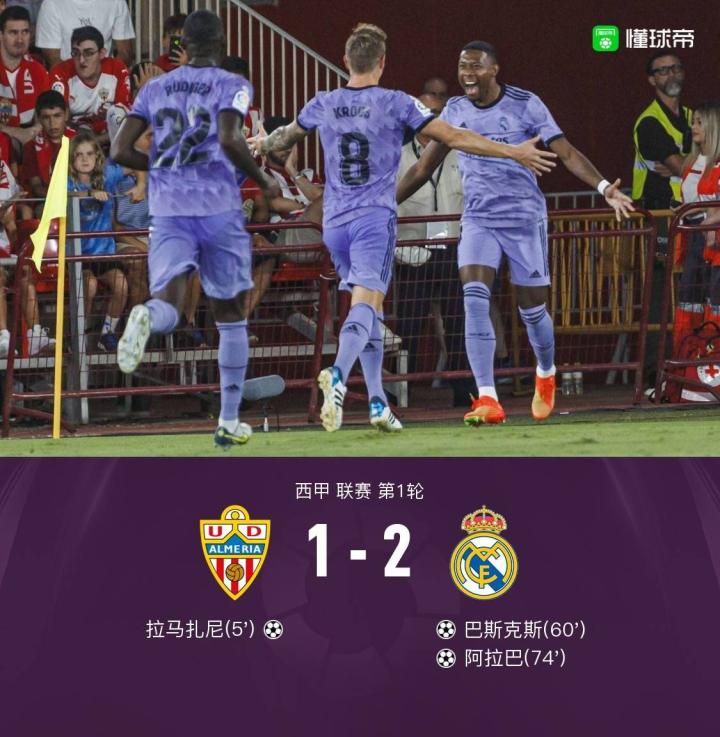 【皇马2-1逆转阿尔梅里亚,阿拉巴任意球世界波,巴斯克斯建功】