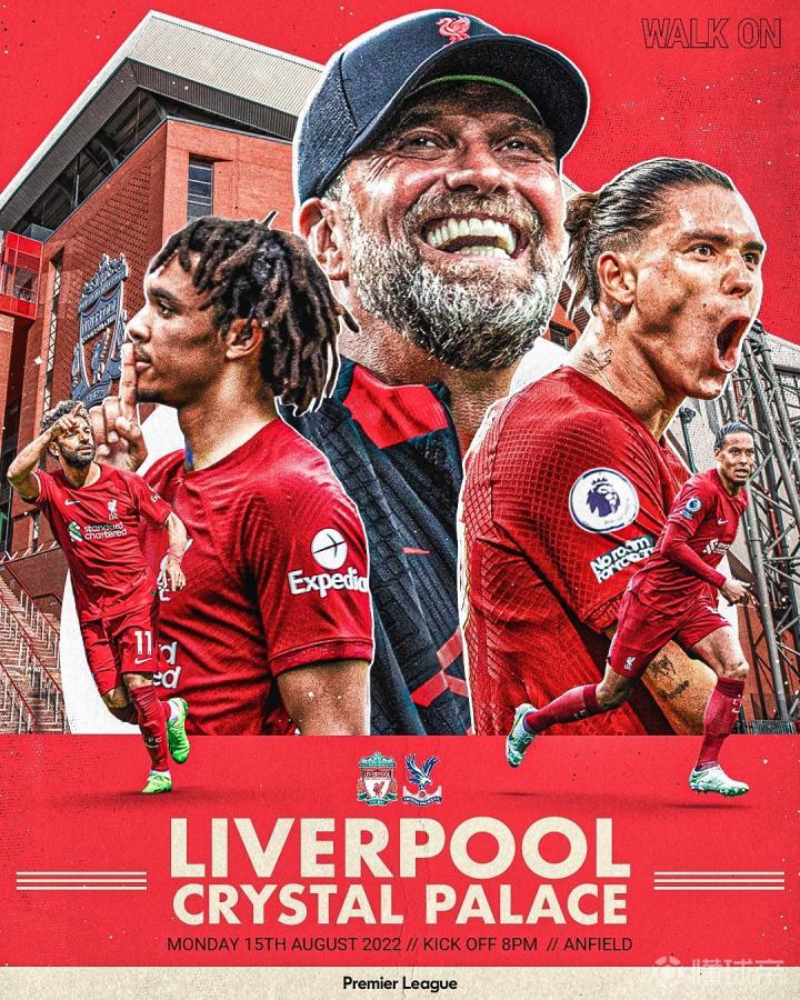 迎新赛季安菲尔德英超首战,利物浦官方发布比赛海报ETChalmers @懂球帝2022-08-15 15:25迎来新赛季安菲尔德球场英超首战,利物浦官方发布比赛海报。北京时间8月16日凌晨,英超第2轮,利物浦将主场对阵水晶宫,迎来新赛季英超首个主场比赛。赛前,利物浦官方发布比赛海报,克洛普领衔,努涅斯、阿诺德、萨拉赫和范戴克出镜。展开更多