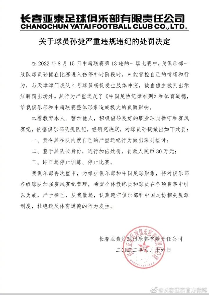北京时间8月16日晚,长春亚泰官方消息,对队长孙捷队内停赛、停训并罚款30万。此前与孙捷冲突的杨帆被津门虎官方罚款20万并三停。