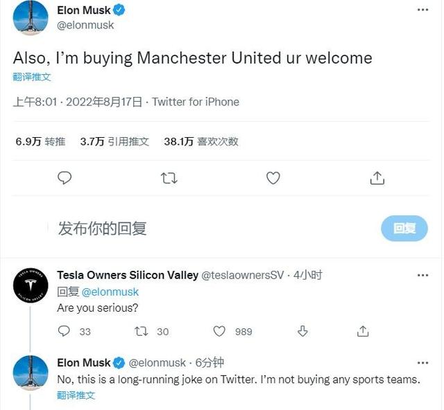 四个小时后马斯克就在这条消息下辟谣:“不,这只是一个老梗,我是不会买任何运动队伍的”。