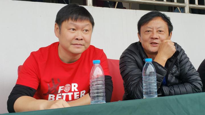 2018年国庆,成都市足协主席辜建明和兴城俱乐部常务副总姚夏督战冲乙比赛(本文作者拍摄)