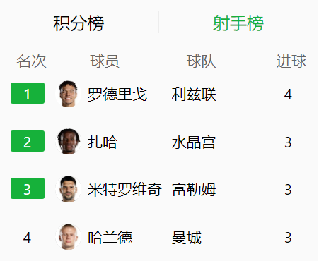 3、哈里森目前并列英超助攻榜榜首(3助),而罗德里戈位居射手榜榜首(4球)。