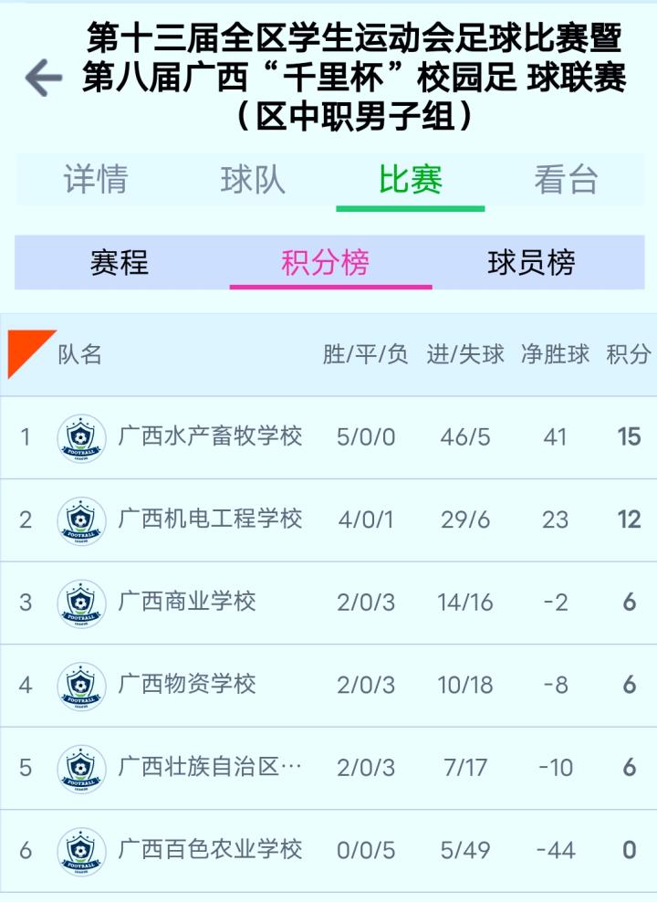 (广西水产畜牧学校5战全胜,进46球失5球,以绝对优势问鼎冠军)