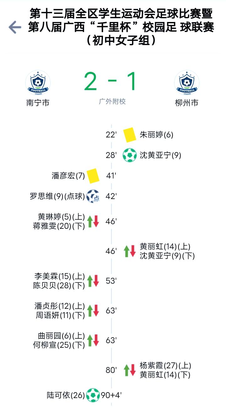 区初中女子组方面:半决赛,国字号球员潘彦宏梅开二度,曲丽园双响,南宁市4-0击败贵港市进入决赛;另外一场半决赛,沈黄亚宁梅开二度,施柳滋、陈梦涵各得一分,柳州市4-1击败桂林市和南宁市会师决赛。桂林市通过点球大战4-3击败贵港队夺得第三名。决赛场,沈黄亚宁28分钟帮助柳州市首开纪录,罗思维42分钟帮助南宁市扳平比分,第94分钟,南宁市的陆可依一剑封喉,帮助南宁市2-1击败柳州队夺得冠军。