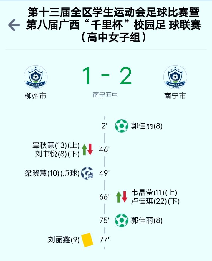 区高中女子组方面:半决赛南宁市和柳州市“提前展开决赛争夺”,虽然柳州市由梁晓慧点球一度扳平,但郭佳丽的梅开二度还是帮助南宁市2-1击败柳州市闯入决赛;另外一场半决赛,梧州市的林小燕、林少萍破门,钦州市的滕嘉慧、郑咏琪得分,双方90分钟2-2战平,点球大战梧州市4-3击败钦州市,进入决赛。三四名决赛,钦州市点球6-5击败柳州市夺得第三名。决赛场,南宁市12-0击败梧州市收割冠军,郭佳丽、廖家泳帽子戏法,荆晶、潘思思、邓倩倩、莫祖玉、韦晶莹、劳珍珍各得一分,至此南宁市包揽初中女子组和高中女子组的冠军。