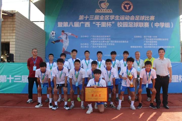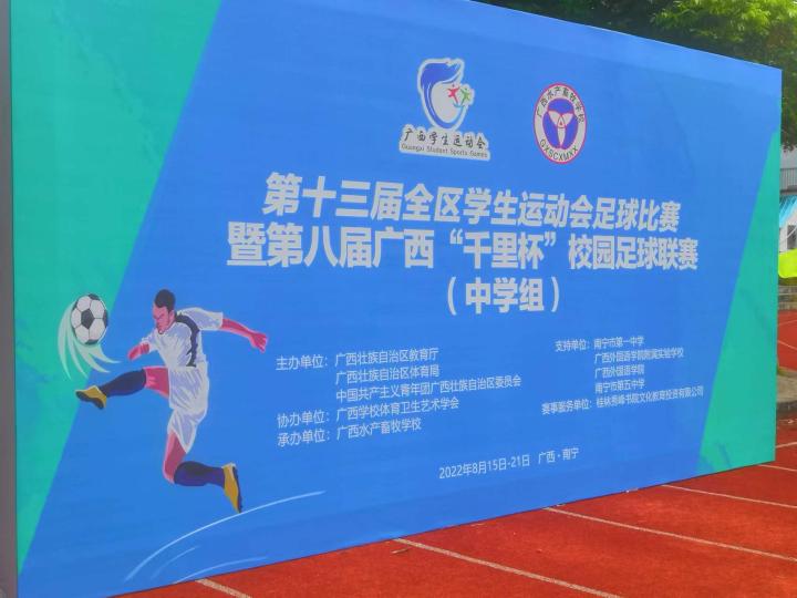 第十三届全区学生运动会足球比赛暨第八届广西“千里杯”校园足球联赛(中学组)8月15日-21日在南宁举行。来自广西12个地市、8所区直中职学校的52支参赛队伍,1300多名师生齐聚南宁,联袂献上一场精彩纷呈的校园足球竞赛盛宴。历时7天,共上演了108场校园足球“巅峰对决”。最终,广西水产畜牧学校获得区中职男子组冠军,广西玉林农业学校获得区中职女子组冠军,南宁市包揽高中女子组和初中女子组冠军,贺州市包揽高中男子组和初中男子组冠军。