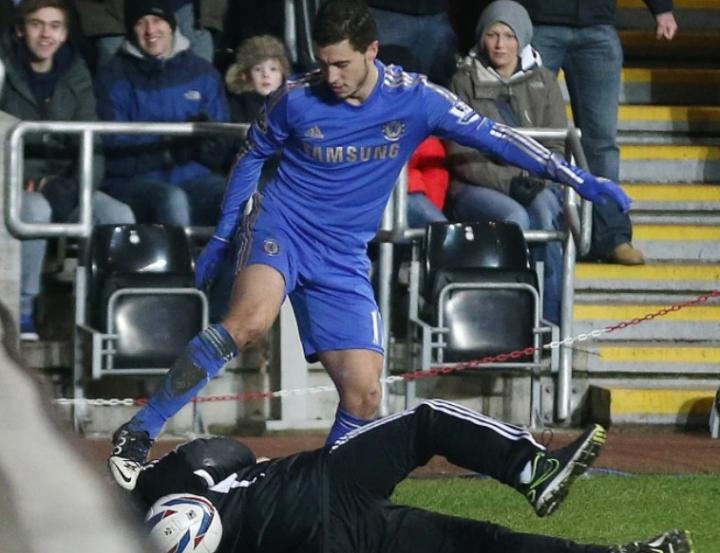2012-13赛季的英格兰联赛杯半决赛中,当时切尔西对阵斯旺西,比赛的焦点是阿扎尔怒踢场边的小球童查理-摩根。这个事件在英格兰引起轩然大波,事后阿扎尔向小球童道歉。比赛第77分钟,球出界了,当时急于进攻的阿扎尔将小球童查理-摩根推倒在地,并且补了一脚。之后引起了双方球员的冲突,阿扎尔被红牌罚下。